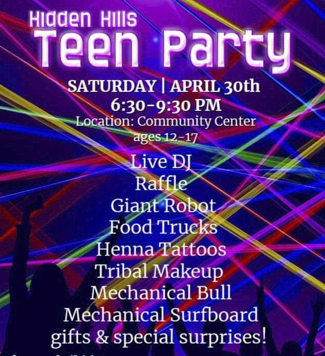 Hidden Hills resident teens aged 12 - 17 years old are invited to a party at the Community Center on Saturday April 30th. This is residents only please