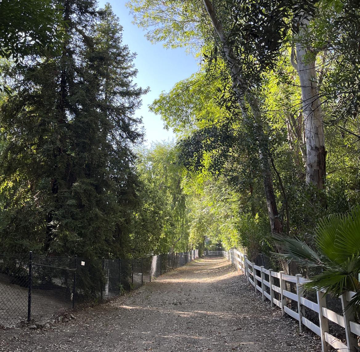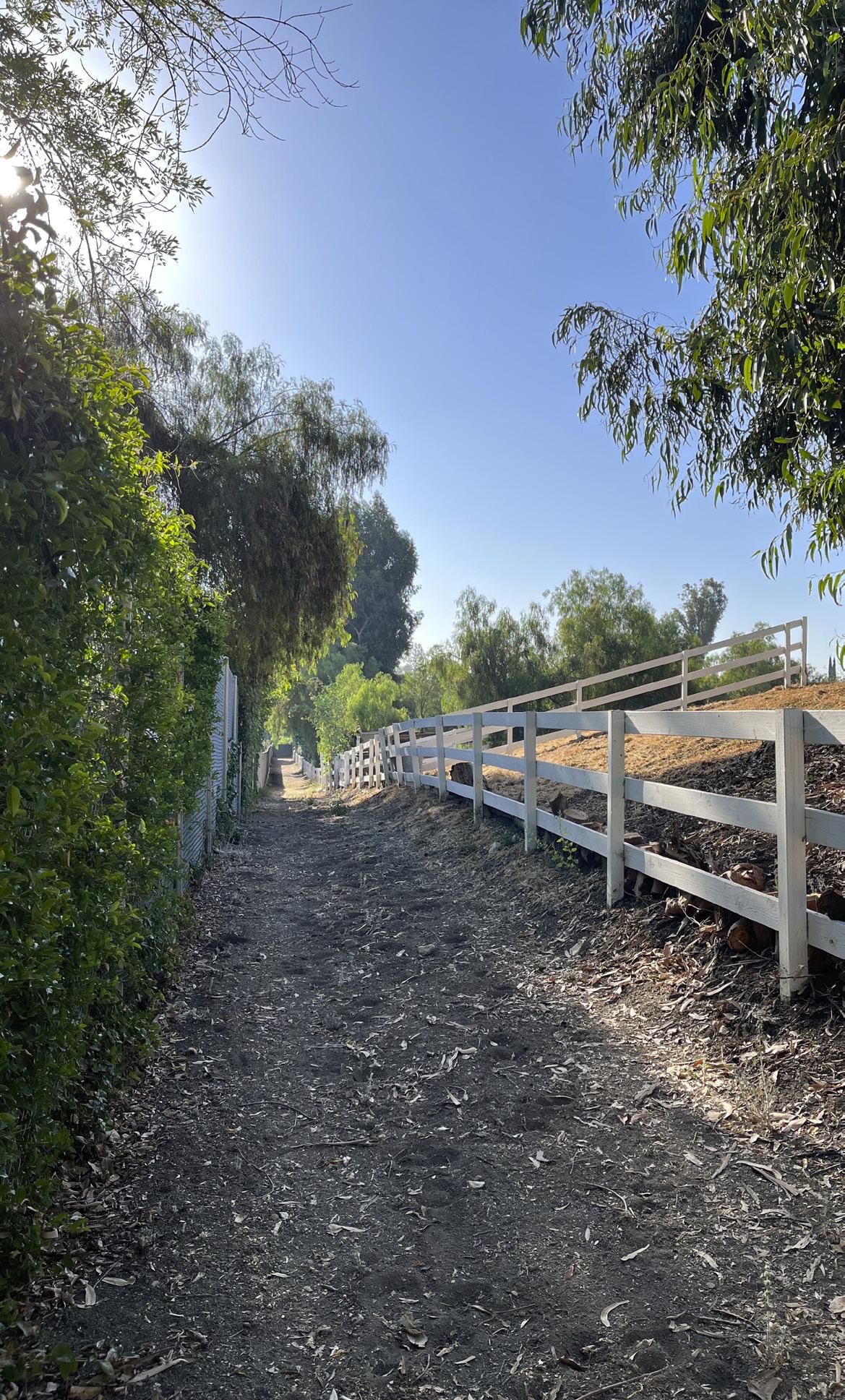 One passes by many of the finer backyard barns, paddocks and arenas in our community reminding us of the joys of equestrianism and why we moved here. It is along this rarely trafficked path that livestock and wildlife are commonly seen. Coyotes, rabbits, hawks, and squirrels exist alongside the horses. There are several ascents leading to clear panoramic views of the San Fernando Valley. When one reaches the peaks, of which there are several, Warner Center and Woodland Hills can be seen to the east in addition to views of the western San Fernando Valley. There are several paths