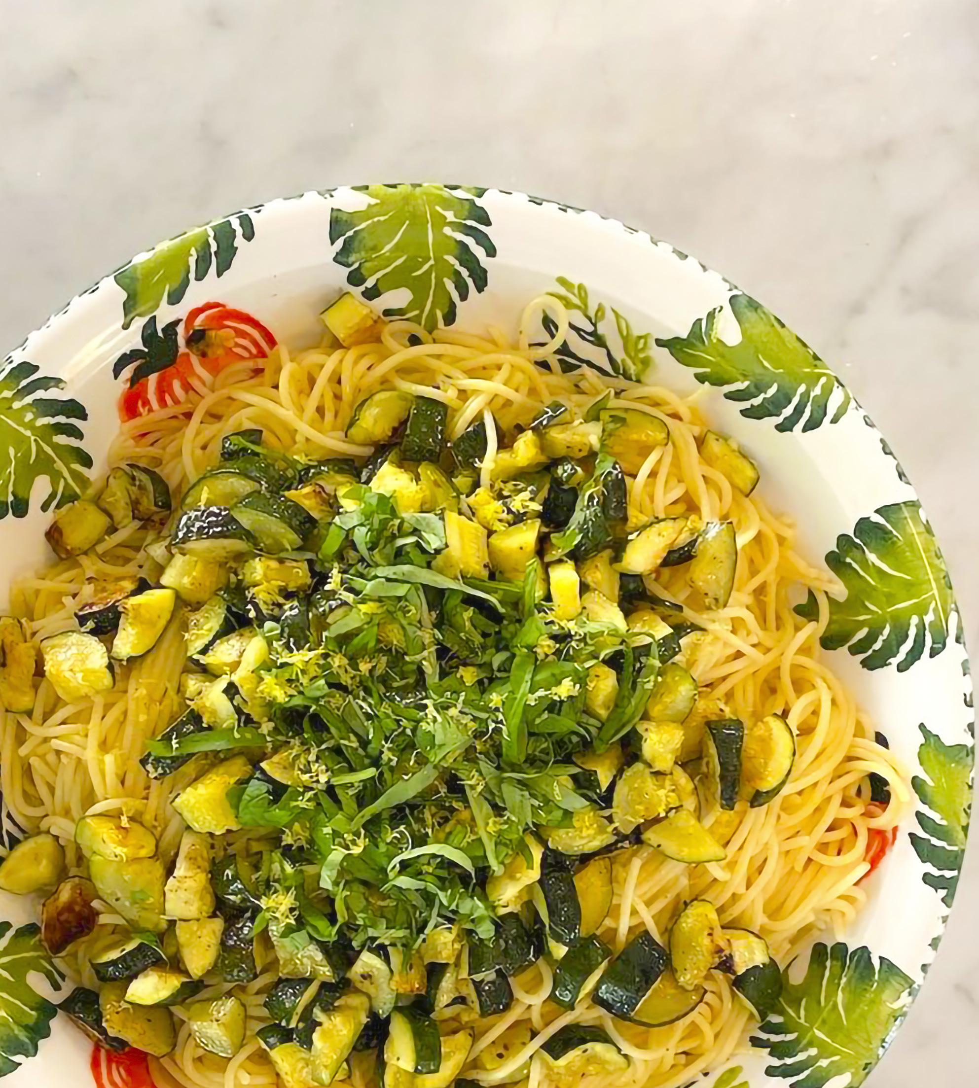 Thisis a great summer dish since fresh zucchini and basil are plentiful. The spaghetti can be replaced with another pasta if you don’t have it on hand. Serve with a fresh green salad and warm crusty bread.