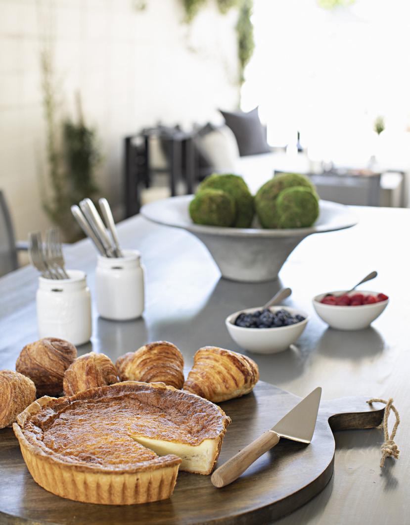 large outdoor living space with courtyard and gardens for relaxation, a chef’s kitchen and pantry which are accessible to guests at any time. During the week, complimentary breakfast items include specialty coffees, fruit, granola, cereal, and yogurt available daily. On weekend mornings, from 8:30 to 10:30 a.m., sumptuous locally baked quiche,