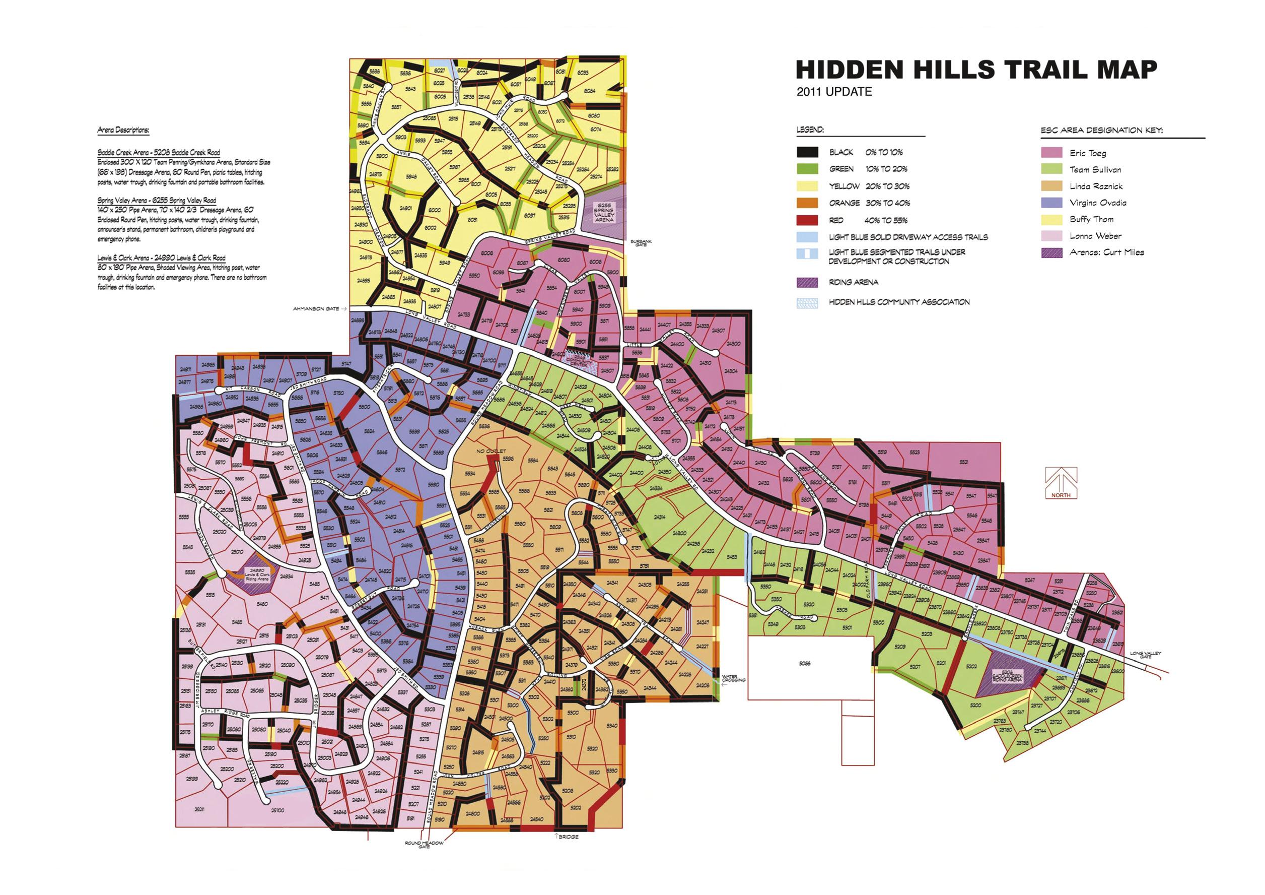 The Hidden Hills Equestrian Services Committee (ESC) oversees the repairs and maintenance of the trail systems, the Saddle Creek, Spring Valley, and Lewis & Clark Arenas. It assists and advises the HHCA Board of Directors and Management in establishing and promoting equestrian policy, education, safety, health,