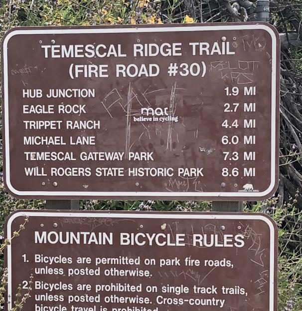 We started our ride at the 21300 block of Mulholland Drive where the road turns into a dirt road. There was a time when you could drive your car across the mountain to the west side of LA. It now is Topanga State Park for hiking, biking and equestrian riding. We rode for a few miles and made a right turn on Temescal Ridge Trail heading to HUB Junction. Then from the HUB we ventured out to Eagle Rock and then to Trippet Ranch,
