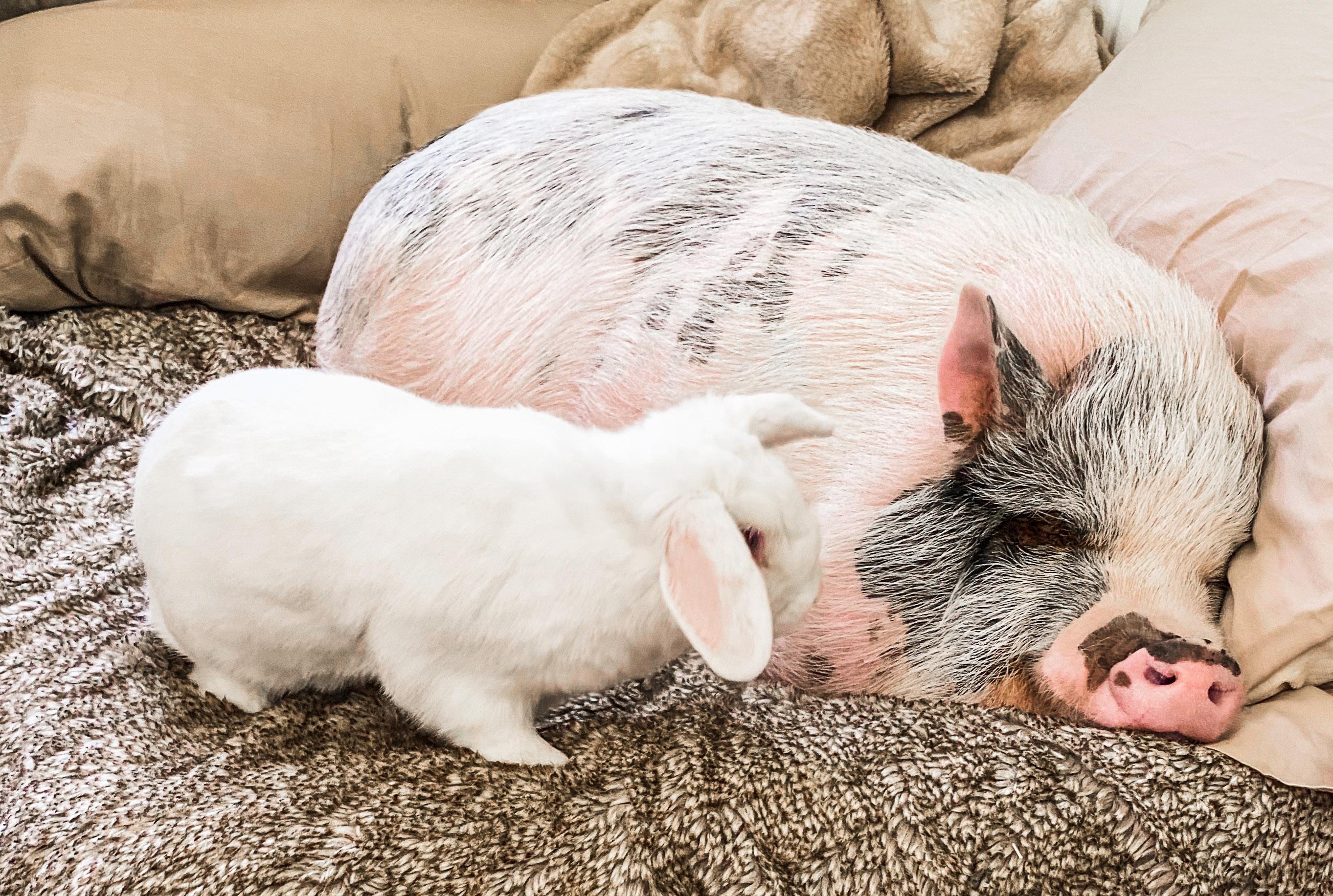 Tucker is a 2 year old Julianna pig and Daisy is a 1 year old Lionhead /Holland Lop bunny who have become the best of friends. They love hanging out together and have built a trusting friendship. You never know who you might get along with, until you try. -Holly
