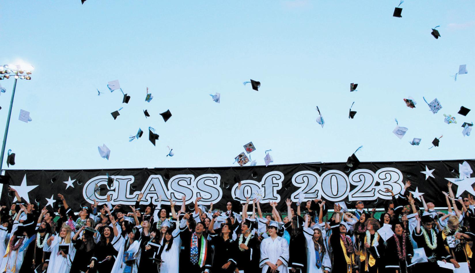 Members of Templeton High School’s Class of 2023 toss their caps in the air after they were officially named graduates at the commencement ceremony June 8 at Volunteer Stadium. Photo by Matt MacFarlane