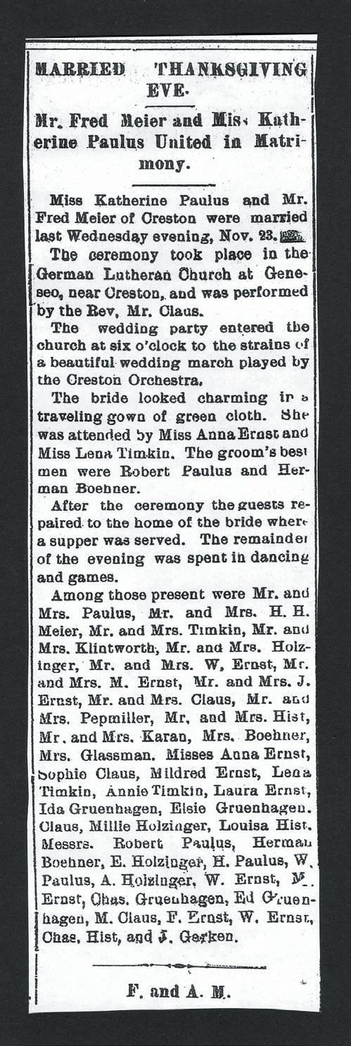The wedding occurred on Thanksgiving Eve, November 28, 1898, at Bethlehem Lutheran Church in Geneseo-Creston. Reverend Claus solemnized their vows, which were witnessed by loved ones gathered in celebration.