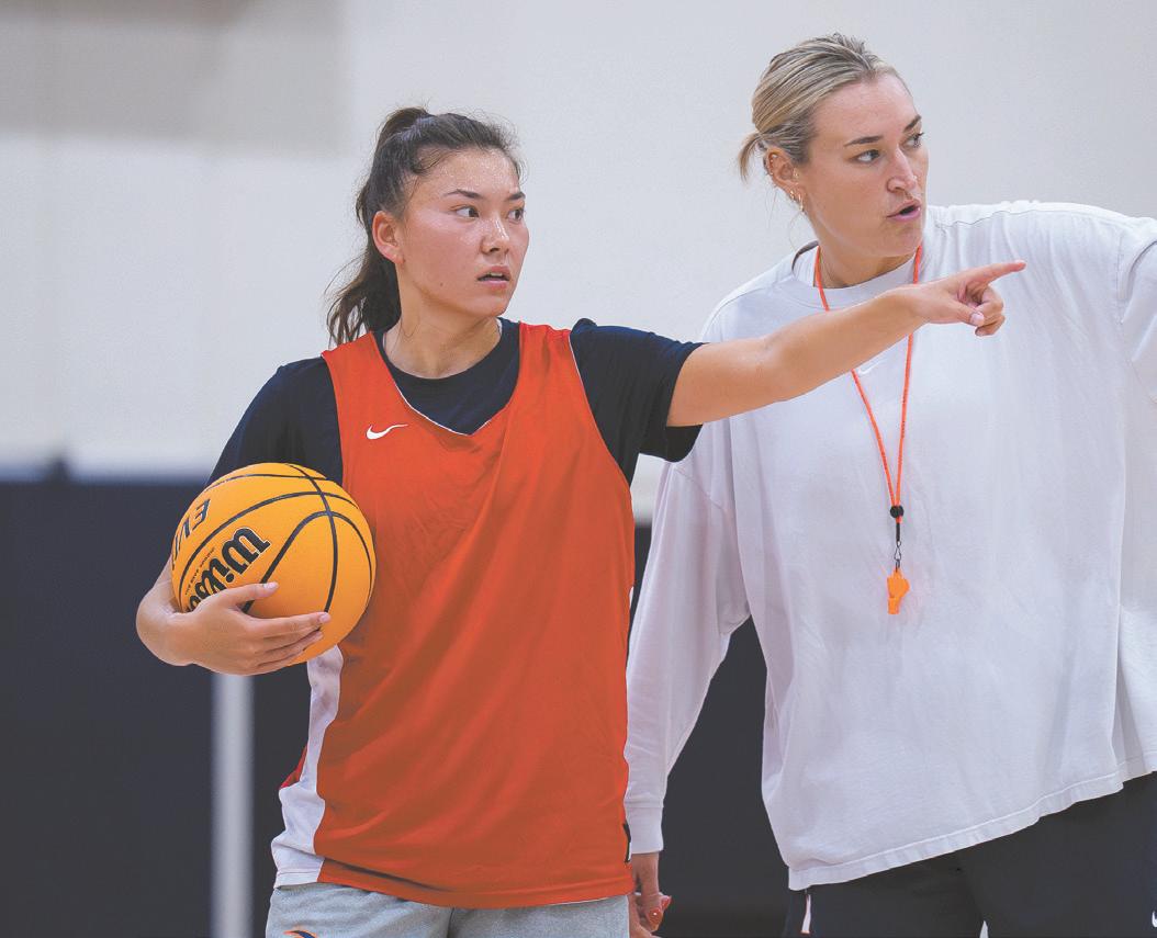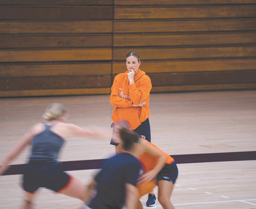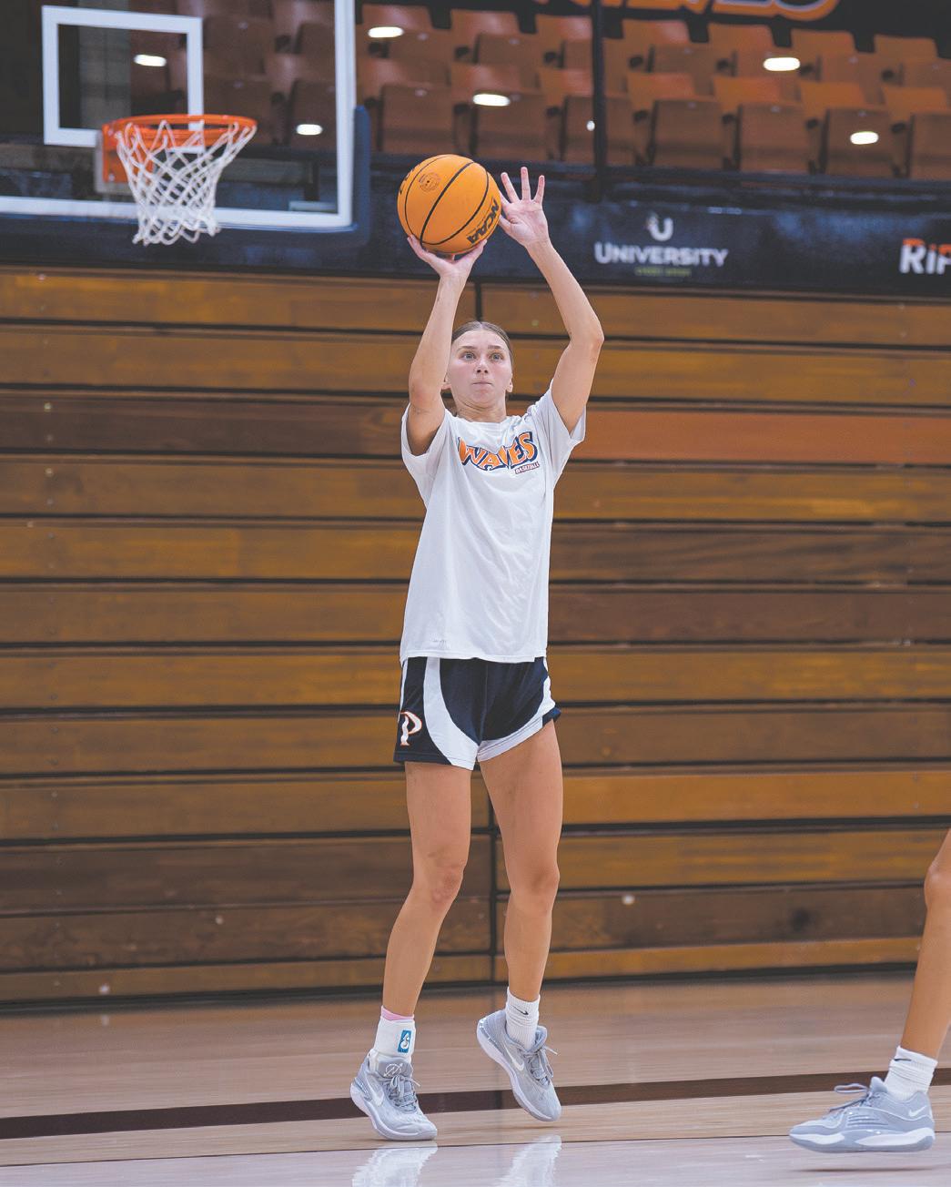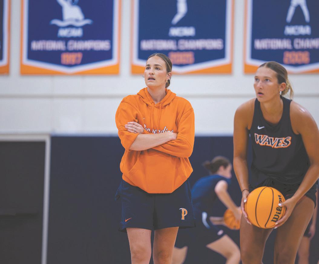 women’s basketball coach Katie Faulkner observes Helena Friend (right). (Bottom left) The Waves’ Malia Mastora, one of three transfers to Pepperdine this year, consults with assistant coach Joslyn Tinkle. (Bottom right) Pepperdine guard Ella Brubaker takes a shot during a recent Waves women’s basketball practice. Brubaker, a graduate student, is one of several returning players for Pepperdine. Photos courtesy of Pepperdine University
