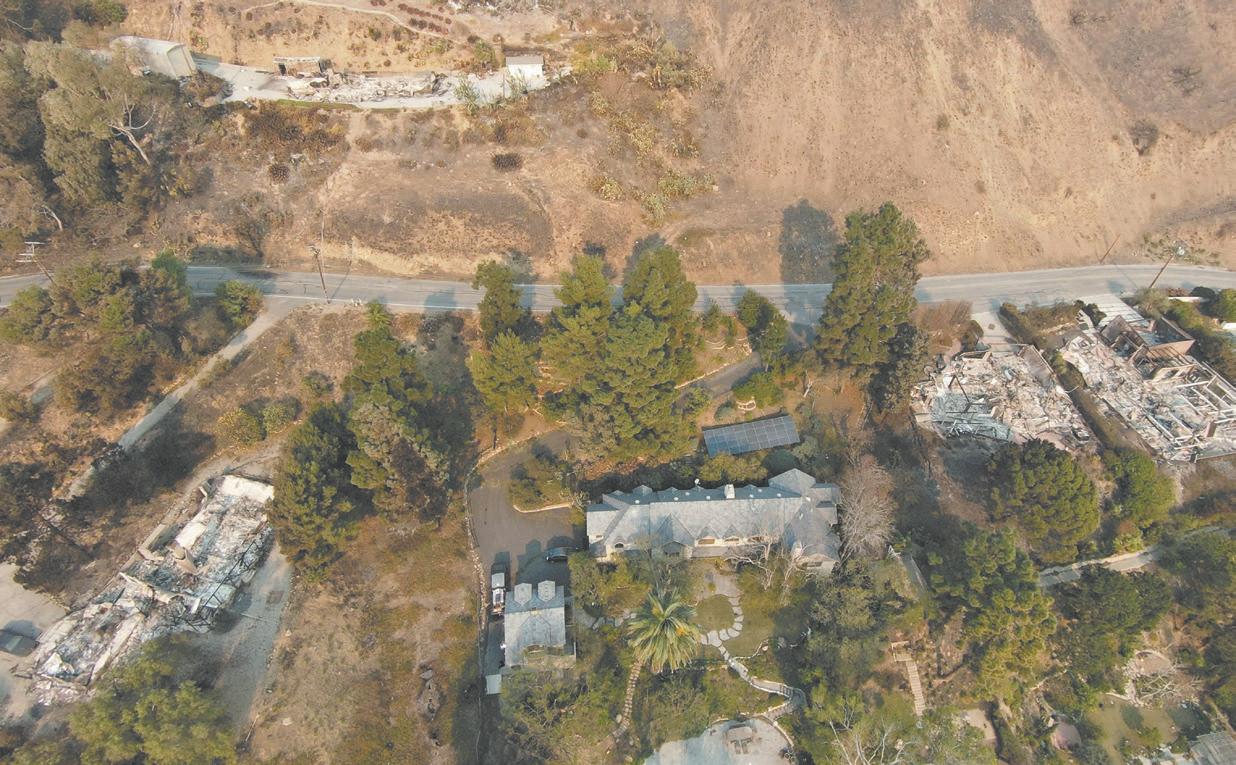 Aerial view of the Woolsey Fire showing the estates of Mark Hamill and other homeowners whose properties were protected by Bobby Milstein’s