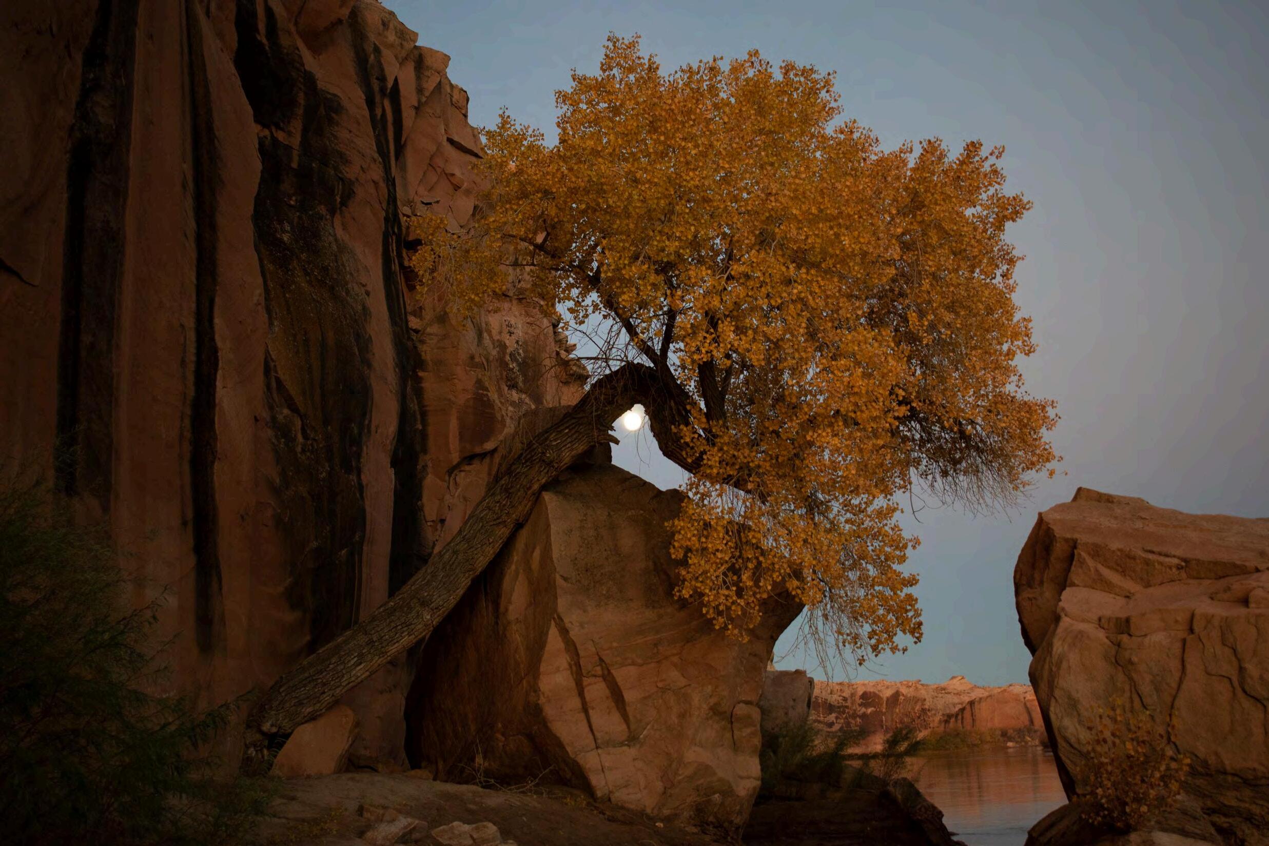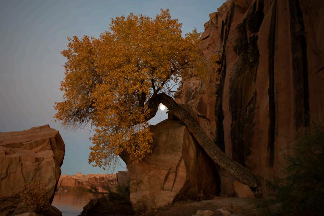The cottonwood tree is a native species associated with river landscapes of the west and southwest. Its populations have come under pressure through the human consumption of water and competition withinvasiveplantslikesaltcedar.Here,a cottonwood tree continues to stand despite the flood-prone canyon, having grown up against a rocky wall and being blocked by a boulder, a sign that native species are meant to thrive in the challengingconditionsoftheSouthwest.
