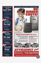 AMERICAN LUNG SOCIETY 10 Year Parts and Lifetime Warranty on Furnace Heat Exchange. Lifetime unit * * Includes FREE carbon monoxide and gas leak test with a Furnace Tune up. * * Call today for your Free consultation! 719.249.6809 www.efficiency1st.com Free Estimates • 24-Hour Service • Financing Available NO HIDDEN COSTS! Keep Comfortable for Less Expert Care of Your System THE HIGHEST QUALITY SERVICE AND EQUIPMENT SKILLED TEAM IS ALWAYS ON TIME AND PROFESSIONAL Serving Colorado Springs for 22 Years Our customers have trusted EFFICIENCY 1st to help them select the comfort system that best fits their home and budget. local family owned and operated for details Expires 5/31/24
