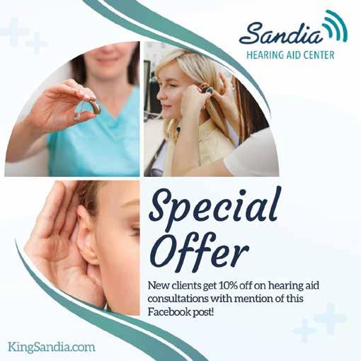 CALL TO ADVERTISE 719-602-4363 I Find More at coloradocommunityconnection.com • PG 19 ...GREAT FINDS We are the longest continuously owned hearing aid office in Colorado Springs! Conveniently located at 2403 N. Union, Suite 101 We've been HEAR for you for over 27 years. MOISTURE IN YOUR HEARING AIDS? EAR FLUSHES $25 Each or 2 FOR $40 available in office, with patented EARIGATOR ™ It could just be wax! Ask us about our state-of-the-art hearing aid drier! SPRING DISCOUNTS Stock Hearing Aids Available at Discounted Prices while supplies last with CCC coupon only. Expires 8-31.24 FREE Hearing Test and 30 Day Money Back Guarantee on All New Hearing Aids Call for Details with CCC coupon only. Expires 8-31-24 Rechargeable batteries available for most hearing aids! We carry all major brands of hearing aids. starting at Also serving Pueblo at 2616 North Elizabeth, Pueblo, Colorado 81003. 719-634-6260 • kingsandia.com Service centers include Lamar, Salida and Trinidad. Visit Our Website