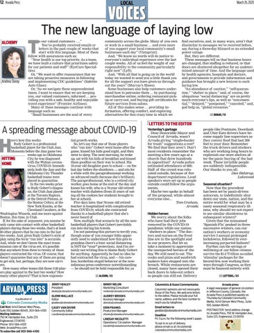 people like Postmate, Doordash and Uber Eats drivers have become supply line superstars as they convey food that last 200 feet to your door. Remember the truck drivers and stockers who are working long hours to replenish our store shelves after the panic buying of the last week. These invisible people are suddenly indispensible. Our thanks to you all. Dan Bidstrup, Lakewood Seasonal situation? Now that the precedent has been set by panic-driven autocrats, to indefinitely shut down our state, nation, and the entire world for what may be a nasty seasonal respiratory illness, why should we not expect to see similar shutdowns in subsequent winters? Given that the misnamed ‘Spanish Flu’ peaked in three successive winters, can our nation’s workers or economy survive 3 annual prolonged lockdowns, followed by everincreasing purported bailouts? Further, can the savings or well-being of our fellow citizens survive the $1-2 Trillion so-called ‘stimulus’ packages for the favored few, now working their ways through Congress, as they must be financed entirely with SEE LETTERS, P23 Arvada press A legal newspaper of general circulation in Jefferson County, Colorado, the Arvada Press is published weekly on Thursday by Colorado Community Media, 14143 Denver West Pkwy., Suite 100, Golden 80401. POSTMASTER: Send address change to: Arvada Press, 750 W. Hampden Ave., Suite 225, Englewood, CO 80110