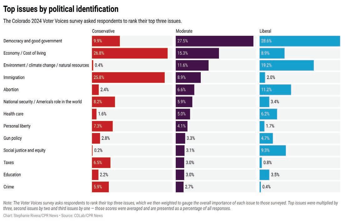 BY TINA GRIEGO, MEGAN VERLEE, NEWS STAFF COLLABORATIVE,ousands of Coloradans responding to a survey by their local newsrooms say candidates competing for their votes this year need to be focused primarily on several broad issues: democracy and good government, the economy and cost of living, the environment, climate and natural resources, immigration and abortion.