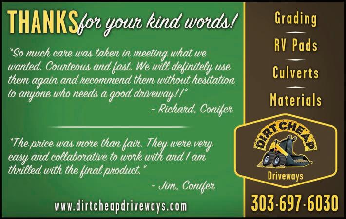THE HAPPY CAMPER JUNE SPECIALS M Y CM MY CY CMY K Dirt Cheap Hustler Ad 6_1_23.pdf 1 5/21/23 8:07 PM Heating, Air Conditioning, Boiler Repairs and Installations ASK FOR DETAILS ON AMANA’S WARRANTY PAYMENT PLANS AVAILABLE WITH APPROVED CREDIT ON NEW PURCHASE/ INSTALLATION $100000 OFF 10% OFF REPAIRS NEW AMANA FURNACE & AC PURCHASE & INSTALLATION. Must present at time of service or repair. Expires 6/30/2023 RESIDENTIAL HOME ONLY excludes service call CALL US TODAY 303-936-2696 • SINCE 1989 RESIDENTIAL AND LT. COMMERCIAL • REPAIRS ON MOST BRANDS PREVENTATIVE MAINTENANCE • REPLACEMENTS AND NEW INSTALLATIONS WE ARE LICENSED, INSURED & NATE CERTIFIED UP TO Call us today at 303-936-2696 www.dnmech.com www.rrroofingandsiding.com (303) 838-8126 P.O. Box 1389 • 60752 US HWY 285 • Bailey, CO 80421 • Fax: (303) 838-5887 • info@rrroofingandsiding.com Roo ng • Gutters • Custom Fabrication Compare bids apples-to-apples. Locally owned and in business for 27 Years. FINANCE OPTIONS AVAILABLE 303-770-7663 .com Solar Systems Roo ng Call Today! 303.420.0420 FREE ESTIMATES Look for our coupons on the back page! 285 PRSRTSTD ECRWSS U.S. POSTAGE PAID THE HUSTLER 27972 Meadow Drive ste 320 Evergreen, CO 80439 POSTAL PATRON WWW.285HUSTLER.COM WEEK OF JUNE 8, 2023 | VOLUME 60 • NO. 24 A publication of