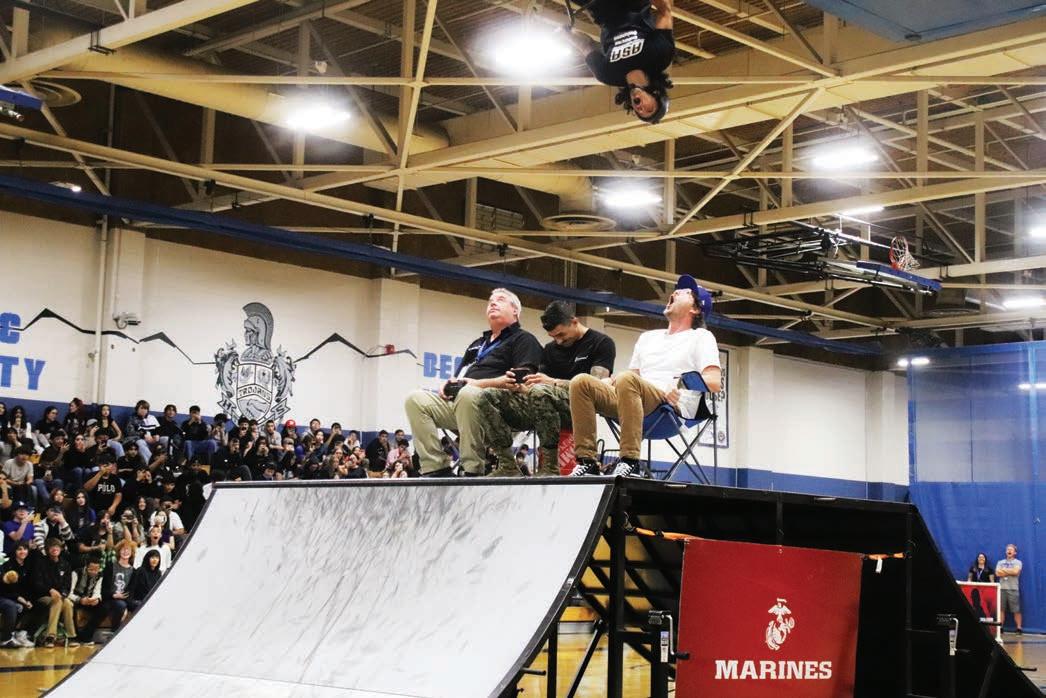 Pro BMX rider Oscar Marquez bravely backflips over a Marine and Thornton High School teachers John Tinsman (left) and Andrew Kuklinski (far right).