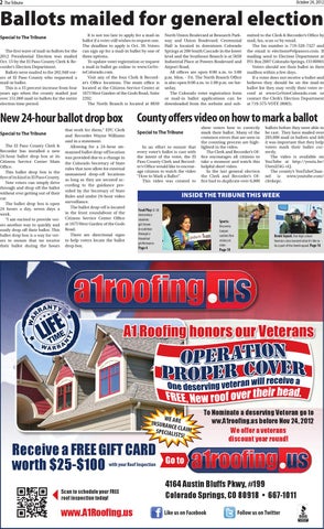 New 24-hour ballot drop box Special to The Tribune The El Paso County Clerk & Recorder has installed a new 24-hour ballot drop box at its Citizens Service Center Main Office. This ballot drop box is the first of its kind in El Paso County. Now voters can simply drive through and drop off the ballot without ever getting out of their car. The ballot drop box is open 24 hours a day, seven days a week. “I am excited to provide voters another way to quickly and easily drop off their ballot. This ballot drop box is a way for voters to ensure that we receive their ballot during the hours