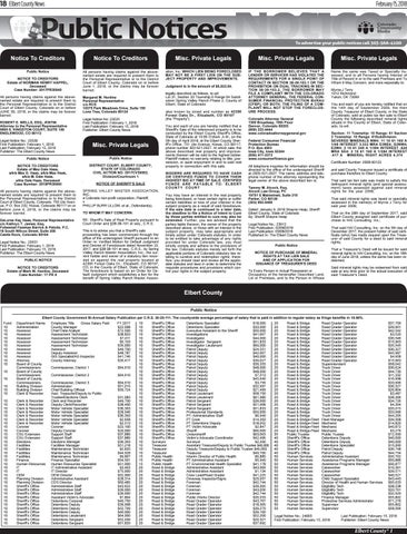 IF THE BORROWER BELIEVES THAT A LENDER OR SERVICER HAS VIOLATED THE REQUIREMENTS FOR A SINGLE POINT OF CONTACT IN SECTION 38-38-103.1 OR THE PROHIBITION ON DUAL TRACKING IN SECJudgment is in the amount of $5,522.54. TION 38-38-103.2, THE BORROWER MAY Myrna J Terry FILE A COMPLAINT WITH THE COLORADO Witness my hand this 1012 Richmond legally described as follows, to wit: ATTORNEY GENERAL, THE FEDERAL CON18th day of January 2018 Yukon, OK 73099 Lot 31, Section 33 Township 6 Range 64 SubdiMargaret M. Henline SUMER FINANCIAL PROTECTION BURAU Richard Pettitt, Public Notice vision Spring Valley Ranch Phase 2, County of Personal Representative Treasurer of Elbert County, Colorado (CFBP), OR BOTH. THE FILING OF A COMYou and each of you are hereby notified that on Elbert, State of Colorado c/o RCS PLAINT WILL NOT STOP THE FORECLOSElbert County The countywide average percentage of salary that is paid in addition to regular salary as fringe benefits in 19.96%. the 14th day of September 2009, the then 10375 Park Meadows Drive, Suite 150 Government Bi-Annual Salary Publication per C.R.S. 30-25-111. Legal Notice No.: 23918 URE PROCESS. also Salary known Paid by streetFYand number County Treasurer County, in the State Lone Tree,Department Colorado 80124 First Publication: 20of Elbert Road & Bridge Road Grader Operator February 1, 2018 $37,709 10 as 42395 Sheriff’s Office Detentions Specialist $18,000 Fund Name Employee Title Gross 2017 Forest Oaks Dr., Elizabeth, CO 80107 of Colorado, sold at public tax lien sale to Elbert Last Publication: Colorado Attorney General 20 Road & Bridge Road Grader Operator February 15, 2018 $39,901 10 Sheriff’s Office Detentions Specialist $33,000 10 Administration County Manager $22,098 (the “Property”). County the following described mineral rights Legal No: 23525 Publisher: The Elbert County News $42,542 1300 Broadway, 10th Floor 20 Road & Bridge Road Grader Operator 10 Sheriff’s Office Executive Assistant to the Sheriff $50,000 10 Notice Assessor Chief Data Analyst $72,500 situate in the County of Elbert, State of ColorFirst February 1, 2018 Denver, Colorado 80203 20 Road & Bridge Road Grader Operator $3,520 10 Sheriff’s Office Investigations $41,667 10 Publication: Assessor Assessment Technician $38,833 You and each of you are hereby notified that a ado, to-wit: Last Publication: February 15, 2018 (800) 222-4444 20 Road & Bridge Road Grader Operator $36,546 10 is toSheriff’s Office Investigator $44,000 10 Assessor Assessment Technician $7,011 property Sheriff's Sale of the referenced be Publisher: Elbert County News Assessment Technician www.coloradoattorneygeneral.gov 20 Road & Bridge Road Grader Operator $15,963 10 Sheriff’s Office Investigator Sergeant $51,833 10 Assessor $5,103 conducted by the Elbert County Sheriff's Office, Section: 11 Township: 10 Range: 61 Section & Bridge Road Grader Operator $35,545 10 onSheriff’s Office Investigator Lieutenant $60,000 1020 10 Assessor Assessment Technician $35,000 State of Colorado at 10:00 O’clock .A.M., the 2 Township: Range:Road 61Subdivision: Federal Consumer Financial 20 Road Bridge Road Grader Operator $36,327 10 Sheriff’s Office Patrol Deputy $24,551 MINERALS 10 Assessor Assessor $49,700 5th day of April 2018, at the Elbert County SherSEVERED NW4:&11 10 61 160 A Protection Bureau 20 Road & Bridge Road Grader Operator $45,987 Sheriff’s Office Patrol Deputy $42,667 10 Assessor Deputy Assessor iff’s Office, 751 Ute Avenue, $48,787Kiowa,10 CO 80117, 1/48 INTEREST 3.333 MRA E2NE4; S2NW4; P.O. Box 4503 20 Road &INTEREST Bridge Road Grader Operator $4,958 10 sale,Sheriff’s Office Patrol Deputy $40,000 10 Assessor GIS Specialist/AG Inspector $41,746At which phone number 303 621-2027. the E2W4: 2 10 61 240 A 1/384 .624 Iowa City, Iowa 52244 20 Road & Bridge Road Grader Operator $15,963 10 Sheriff’s Office Patrol Deputy $39,027 10 Attorney County Attorney $35,417 above described real property and improveMRA SE4: 2 10 61 160 A 1/384 INTEREST (855) 411-2372 20 Road & Bridge Superintendent $58,042 10 bidder. Sheriff’s Office Patrol Deputy $39,333 10 Board of County ments thereon will be sold to the highest .417 A MINERAL RIGHT ACRES 4.374 www.consumerfinance.gov 20 Road & Bridge Truck Driver $36,624 Sheriff’s Office Patrol Deputy $48,000 Commissioners Commissioner, District 1 $64,610 Plaintiff makes no warranty relating10 to title, pos20 2008-90123 Road & Bridge Truck Driver $44,730 $48,000 10 Board of County session, or quiet enjoyment in and10 to said Sheriff’s Office real Certificate Number: All telephone Patrol Deputy inquiries for information should be 20 Road & Bridge Truck Driver $11,332 10 Sheriff’s Office Patrol Deputy $7,513 Commissioners Commissioner, District 2 property in connection$64,610 with this sale. directed to the office of the undersigned Sheriff 20 Road & Bridge Truck Driver $16,998 10 Sheriff’s Office Patrol Deputy $45,640 10 Board of County and said County Treasurer issued a certificate of at (303) 621-2027. The name, address and tele20 to Elbert Road & Bridge Truck Driver $33,996 10 CASH Sheriff’s Office Patrol Deputy $3,756 Commissioners Commissioner, District 3 $64,610 TO HAVE BIDDERS ARE REQUIRED purchase therefore County. phone number of the attorney representing the 20 Road & Bridge Truck Driver $36,327 10 THEIR Sheriff’s Office Patrol Deputy $32,997 10 Building Division Administrator $51,015 OR CERTIFIED FUNDS TO COVER legal owner of the above described lien is: 20sale was Road & Bridge Truck Driver $26,804 Sheriff’s Office Patrol Deputy $21,499 10 Building Division Chief Building Official $59,724 HIGHEST BID AT TIME OF SALE.10 CERTIFIED That said tax lien made to satisfy the 20 Road & Bridge Truck Driver $3,487 10 Sheriff’s Office Patrol Lieutenant $58,750 10 Clerk & Recorder Asst. Treasurer/Deputy to Public FUNDS ARE PAYABLE TO: ELBERT delinquent mineral rights (and special assessTammy M. Alcock, Esq. 20 Road & Bridge Truck Driver $38,306 10 Sheriff