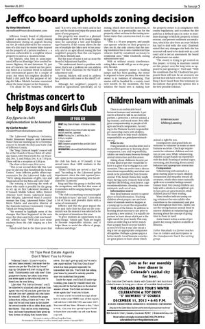 creader@ourcoloradonews.com The Lakewood Symphony Orchestra, Rocky Mountain Ringers and Lakewood Stake Choir are teaming up for a Christmas concert to benefit the Boys and Girls Club of Jefferson County. The “Sing, Choirs of Angels” concert will be at the Church of Jesus Christ of Latterday Saints, 6465 West Jewell Ave. on Thursday, Dec. 5, and Friday, Dec. 6, at 7:30 p.m. There will be a reception at 6:30 p.m. The show is first come, first serve. “This is our second show like this. Last year we did one that benefitted the Action Center,” Anne Jefferies, public affairs representative for the Lakewood Stake said. “We’re taking donations of gifts, toys and financial aid for the Boys and Girls Club.” The evening is honoring the work of those who made it possible for the group to set up its first Lakewood location at O’Connell Middle School. Jeffco District Attorney Scott Storey, Lakewood mayor Bob Murphy, Lakewood Ward 3 councilwoman Sue King, Lakewood Police Chief Kevin Paletta and executive director of the Alameda Gateway Community George Valuck are being honored. “We wanted to highlight some of the changes that have happened in the area since the (Boys and Girls) club was founded,” Jefferies said. “We’ll also have some students from the club singing on a few songs.” Valuck said that in the three years that