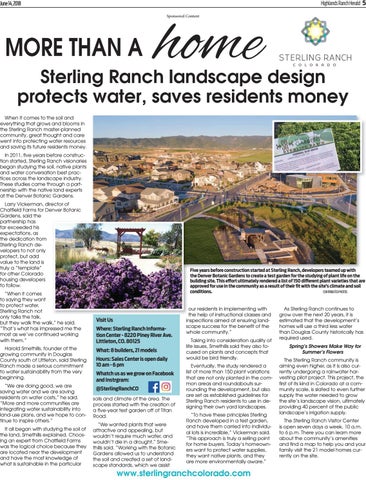 Visit Us Where: Sterling Ranch Information Center - 8220 Piney River Ave. Littleton, CO. 80125 What: 8 builders, 21 models Hours: Sales Center is open daily 10 am - 6 pm Whatch us as we grow on Facebook and Instrgram: @SterlingRanchCO soils and climate of the area. The process started with the creation of a five-year test garden off of Titan Road. “We wanted plants that were attractive and appealing, but wouldn’t require much water, and wouldn’t die in a drought,” Smethills said. “Working with the Botanic Gardens allowed us to understand the soil and created a set of landscape standards, which we assist