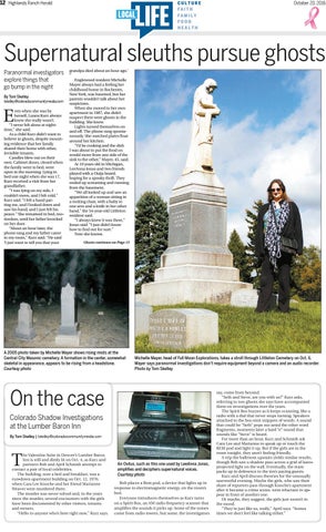 grandpa died about an hour ago.’ ” Englewood resident Michelle Mayer always had a feeling her childhood home in Rochester, New York, was haunted, but her parents wouldn’t talk about her suspicions. When she moved to her own apartment in 1987, she didn’t suspect there were ghosts in the building. She knew. Lights turned themselves on and off. The phone rang spontaneously. She watched plates float around her kitchen. “I’d be cooking and the dish I was about to put the food on would move from one side of the sink to the other,” Mayer, 45, said. At 10 years old in Michigan, LeeAnna Jonas and two friends played with a Ouija board, hoping for a spooky thrill. They ended up screaming and running from the basement. “We all looked up and saw an apparition of a woman sitting in a rocking chair, with a baby in one arm and a knife in her other hand,” the 54-year-old Littleton resident said. “I always knew it was there,” Jonas said. “I just didn’t know how to find out for sure.” Now she knows. Ghosts continues on Page 13