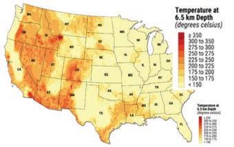 An August 28th article in The New York Times, however, made me aware of progress being made using geothermal resources six miles or deeper underground to run power plants. The map at right shows the temperature at 4 miles depth in Centigrade, where 100º is the boiling point of water. According to the article (a link for which I posted at