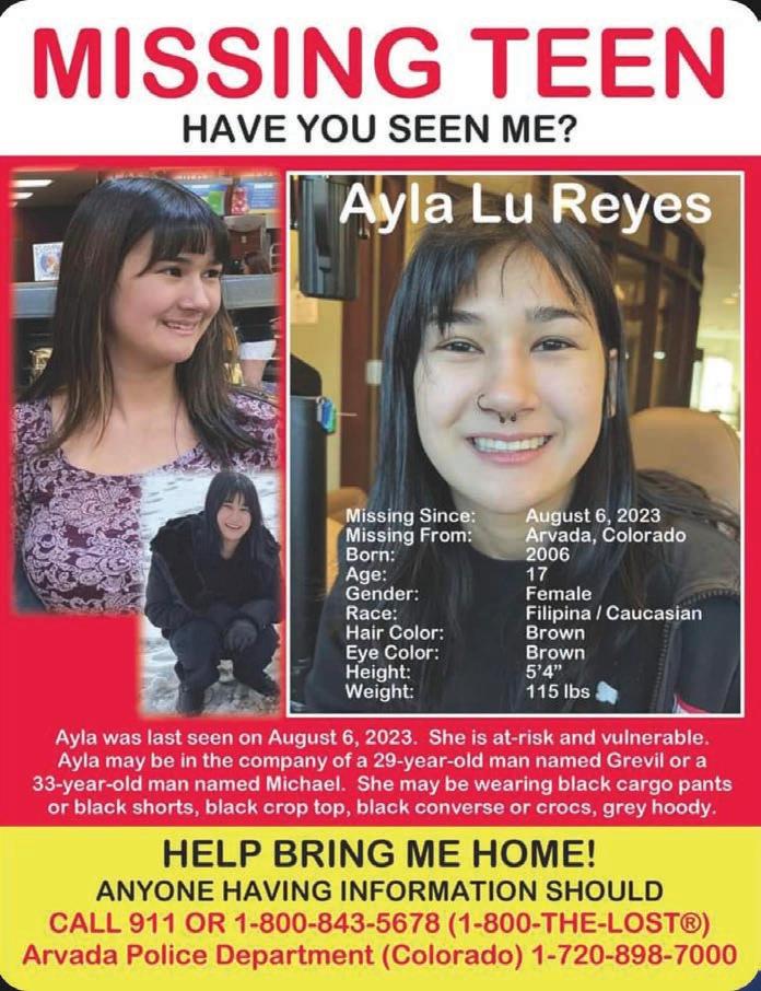 Ayla Reyes has been missing since Aug. 6. e yers emblazoned with her likeness all say that she is endangered and missing. According to Reyes’s aunt, Julie Mitchell, the missing teen may be in the company of a much older man. e Arvada Police are investigating the case as a missing persons case. Everyone wants to bring Ayla home. According to Mitchell, Reyes was last seen on Aug. 6. She described Reyes as a sweet and friendly girl who is also neurodivergent. She is a Filipina and Caucasian girl of 17 who has brown hair, brown eyes, and a septum piercing. Reyes is 5 feet 4 inches, and was last seen wearing black cargo pants or black shorts, a black crop top and/or a gray hoodie along with black Converse sneakers or Crocs.