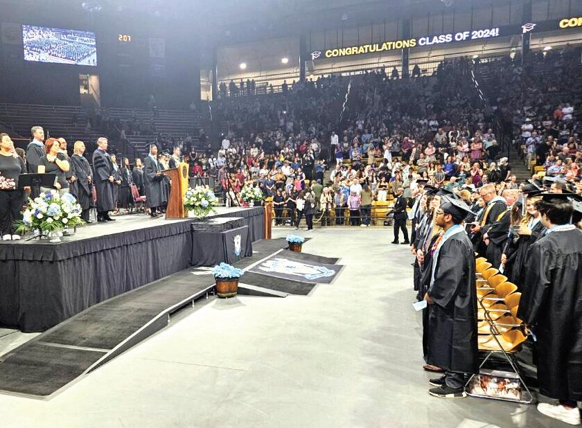 Thornton High School’s Class of 2024 stand during the National Anthem at their commencement ceremony May 13 at the University of Colorado-Boulder’s Event Center.
