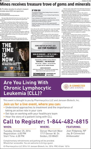 IF YOU GO The Colorado School of Mines Geology Museum is located at 1310 Maple St. in Golden. Museum hours are 9 a.m. to 4 p.m. Monday through Saturday and 1-4 p.m. on Sundays. Drop-in admission to the museum and gift shop is free. Guided tours are also available for a fee. Reservations must be done by phone at least one week in advance. Contact the museum at 303-273-3815 or geomuseum@ mines.edu. Learn more about the museum at www.mines.edu/ Geology_Museum. from all over the world. They join the more than 20,000 specimens the museum already has — plus an additional 20,000 microscopic specimens in the museum’s collection, Raines said. The museum is in possession of the state mineral collection, which started in 1895, he said. And there are about 1,500 specimens on display at any given time at the two-level building on the School of Mines campus in Golden.