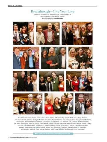 1 Kaben and Sierra Nimtz, Marc Lund 2 April Doyle, Jeff and Kirby Joseph 3 CR and Tiffany Brinton, Jim and Kim Bolt, Seanna Mulligan 4 Drew Strickland, Rosie Orblom, Troy and Courtney McClymonds 5 Veena Dandapani, Brenna Mielenz, Preetam Dandapani 6 Liz Rollins, Lisa Benson, Kim Elmer 7 Mark Kennamer, Dr. Rand Harrington, head of school Kent Denver; Sarah Dutcher, executive director Kent Denver; Janice Laney, co-chair 8 Brooke Brewer, Kyle Bobrick, Lee and Betsy Barrow 9 Christina Caulkins, Jennifer and Sean Waters, Sarah Anschutz 10 Liz Rollins, Aimee and Jonathan Coleman, Blaine Rollins 11 Gretchen McLaughlin, Melinda Karp, Margo Sweany, Matt Troop 12 Marc and Margot Pinto, honorees More photos for these events: coloradoexpression.com 14