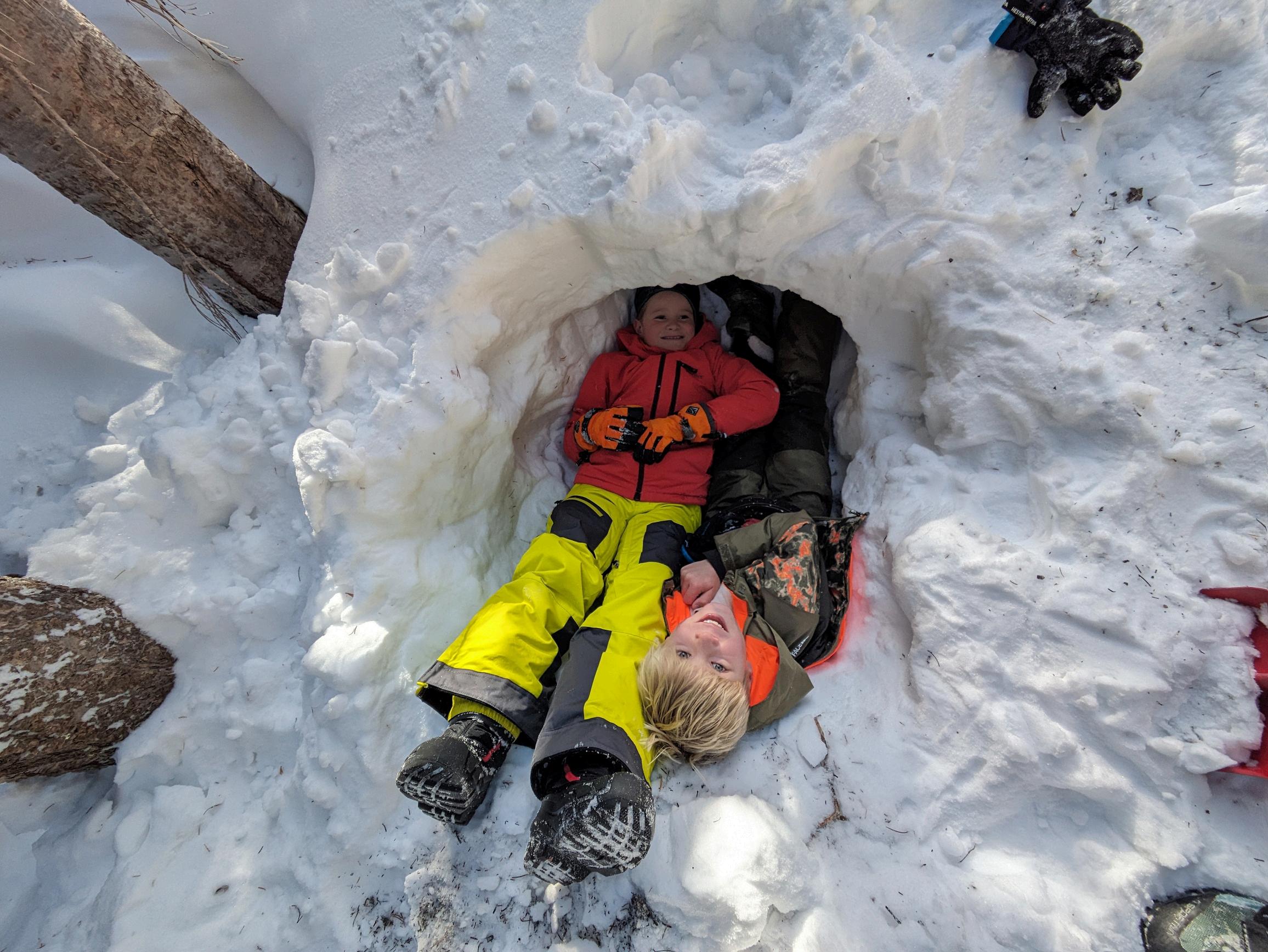 Hours of climbing, snowshoeing, and winter games = one blissfully tired kiddo ready for an early bedtime!