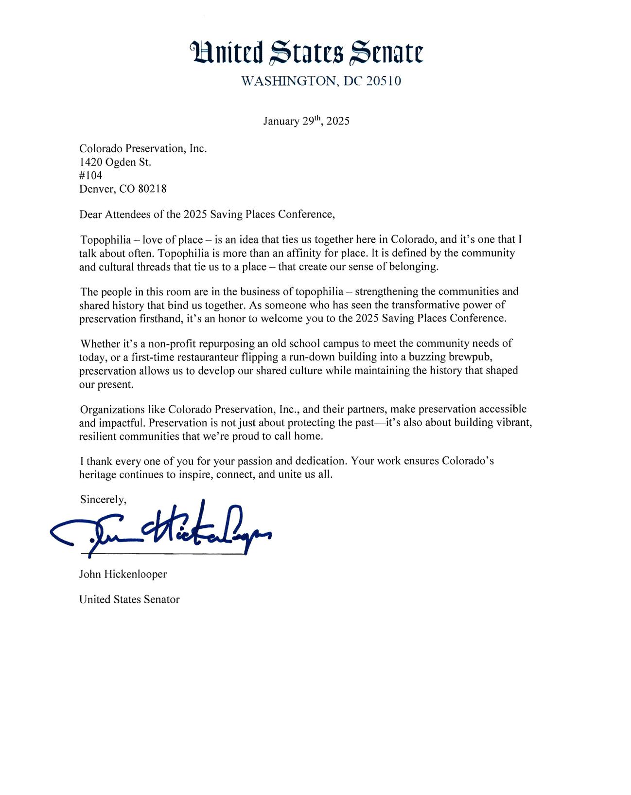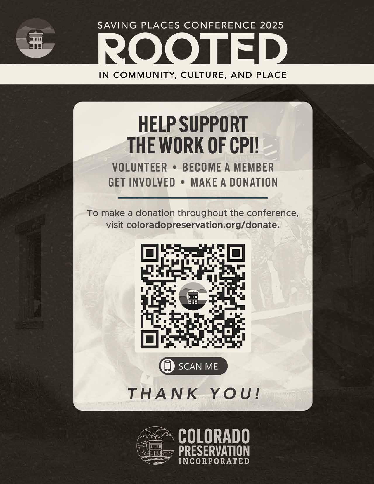For more than 40 years, Colorado Preservation, Inc. (CPI) has been dedicated to promoting, preserving, and protecting the historic places that connect us to our past and inspire our future. Through education, advocacy, and direct action, CPI works to ensure that Colorado’s unique cultural and historical heritage remains vibrant and meaningful for generations to come. The Saving Places Conference embodies this mission by bringing together preservation professionals, community leaders, and advocates to share knowledge, inspire action, and celebrate the stories that make our places significant.