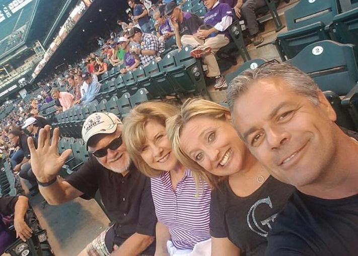 Enjoying the Rockies Ballgame with friends Dennis Johnson, Okie Arnot and boyfriend Steve.