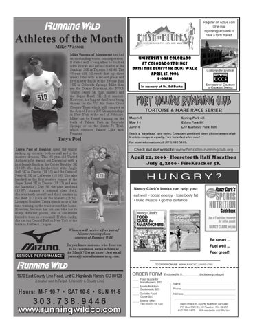 Tanya Poel Tanya Poel of Boulder spent the winter racking up victories both overall and in the masters division. This 40-year-old United Airlines pilot started out December with a first female finish at the Colder Boulder 5K (19:09). She then finished first at the Jingle Bell 5K in Denver (18:51) and the Oatmeal Festival 5K in Lafayette (18:53). She also finished as the first masters runner at the Super Bowl 5K in Denver (19:17) and won the Valentine’s Day 5K the next weekend (19:07). Against a national class field, she was tenth overall and third masters in the Best XC Race on the Planet! (25:58). Living in Boulder, Tanya spends most of her time training on the trails around her home. However, because her job can take her to many different places, she is sometimes forced to train on a treadmill. If she is lucky, she can run Central Park in New York or the trails in Portland, Oregon.