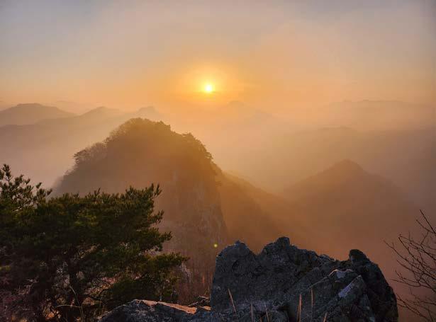 가파른 길과 데크계단을 걸어오르니 큰 바위들이 능선 주위에 나타나기 시작한다. 곧 능선에 도착했 다. 서래봉 주변의 크고 작은 바위로 된 봉우리들이 어울려 멋진 풍경을 자아내고 있다. 서래봉 너머 멀 리 일출이 시작되었다. 최근 몇몇 산에서 대했던 일 출 모습과는 사뭇 다른 모습이다. 운무가 짙게 깔린 산봉우리 너머로 뿌연 구름속에서 태양빛이 구름에 부딪혀 산란하고 태양의 윤곽이 뚜렷하게 보이지 않 는 일출 모습이다.