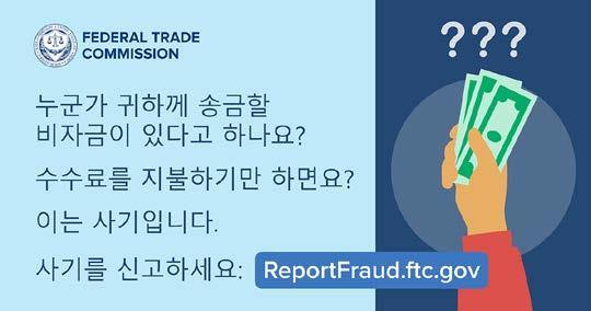귀하가 속한 한인 커뮤니티 및 다른 곳에 이 사기 수법을 널리 공유해 주십시오: • 연락하여 금전적 요구를 하는 사람에게 절대 돈을 송금하지 마십시오. 어떤 사정이 있다고 하더라도 말입니다. • 어떤 나라의 어떤 공무원도 귀하께 송금할 실제 자금을 보유하고 있지 않습니다. 누군가 그렇다고 한다면, 사기꾼입니다.