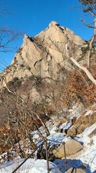 용하게 들린다. 나무 가드레일이 있는 눈 길을 따라 올라 부왕사지에 도착했다. 부왕사는 북한산성 내에 있는 승병 사찰로 지어졌 는데 지금은 석축만 남아 있다. 조금 더 걸어올라 부 왕동암문에 도착했다. 성을 따라 이어지는 호젓한 산길을 조금 걸으니 쇠로 된 가드레일이 있는 눈과 얼음이 많은 가파른 길이 나왔다.
