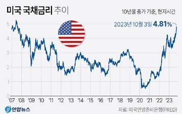 미국 국채금리 추이. 미 연방준비제도(Fed·연준)의 고금리 정책이 기존 예상보다 오래갈 것이란 전망에 무게가 실리면 서 3일(현지시간) 미국 국채 금리가 2007년 이후 16년 만에 최고치를 경신했다. 미 전자거래 플랫폼 트레이드웹에 따르 면 10년 만기 미 국채 수익률은 이날 오후 3시 30분(미 동부시간 기준) 무렵 4.81%로, 글로벌 금융위기 이전인 2007년 8월 이후 16년 만에 가장 높은 수준을 기록했다.(그래프 연합뉴스)