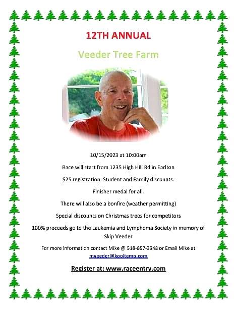 Special discounts on Christmas trees for competitors. 100% of proceeds go to the Leukemia and Lymphoma Society in memory of Skip Veeder. For more information contact Mike at 518-857-3948 or email mveeder@kooltemp.com Register at: www.raceentry.com
