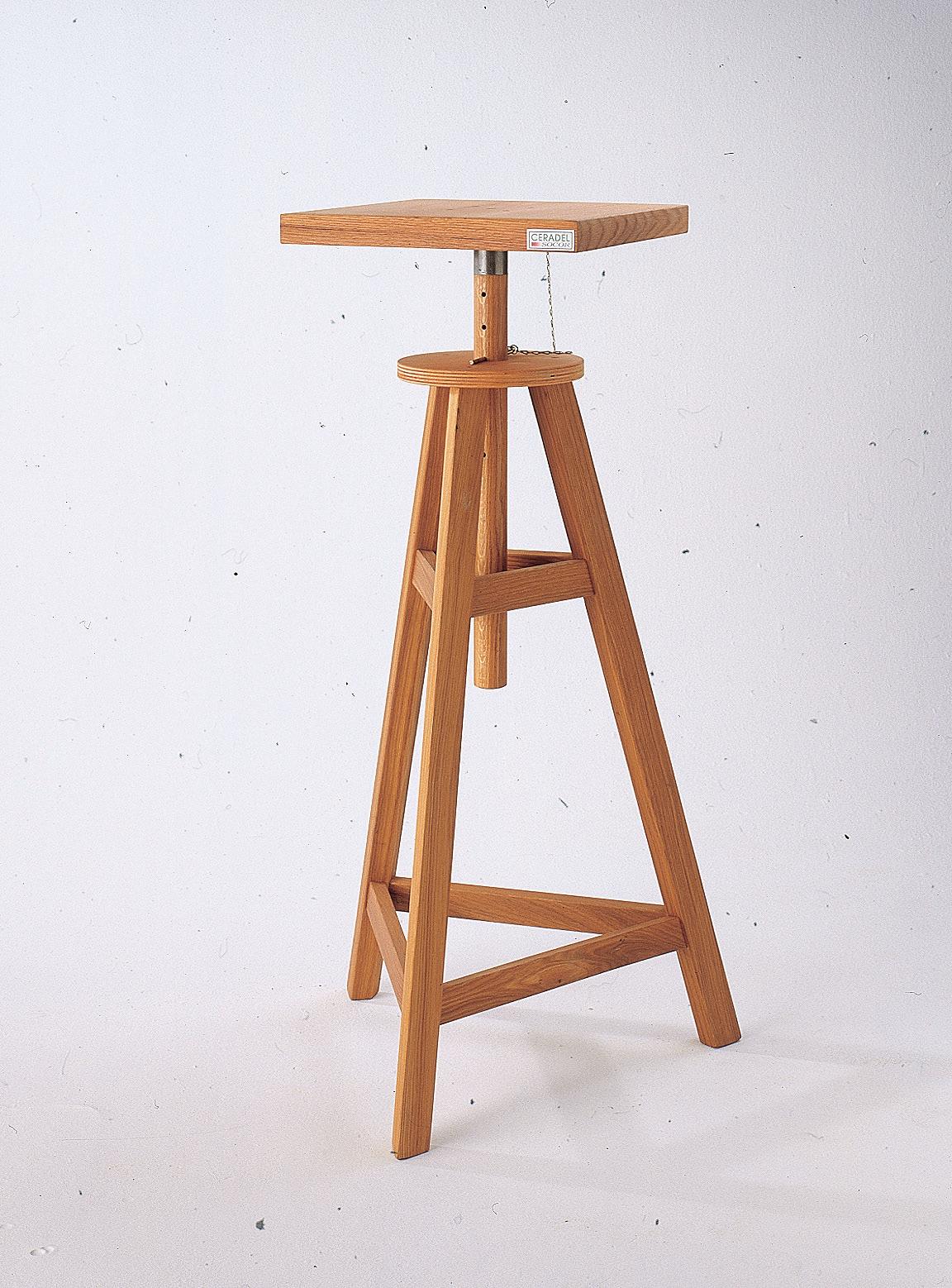 Regelbaar stoeltje voor de draaischijf. Min. hoogte 43 cm, max. 58 cm. Tabouret de tournage à placer devant le tour. Régable en hauteur. H. mini 43 cm maxi 58 cm. In