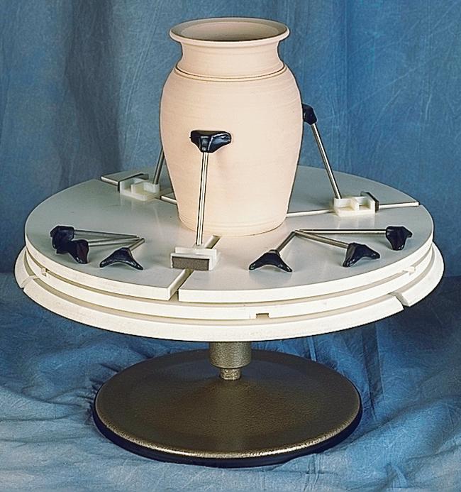 Handige hulp om de werkstukken te centreren, modeleren, draaien en decoreren. Past op draaischijf van 30 cm. Centrage facile de la pièce àmodeler, à tournaser ou à décorer. S’adapte sur girelle de tour. Dimension: 30 cm. M206BO-02 ; 04 ; 05 MAT-43 MAT-42 M150 DRSH20 CE3C