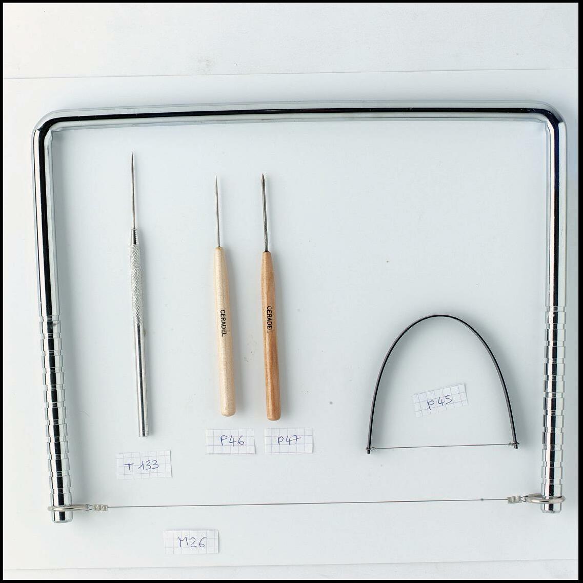 De snijdende bandmiretten worden gebruikt om overbodige klei weg te halen bij het modeleren en draaien. Ces mirettes à fil tranchant coupant sont utilisées par le céramiste, pour enlever de la matière dans le modelage et tournasage.