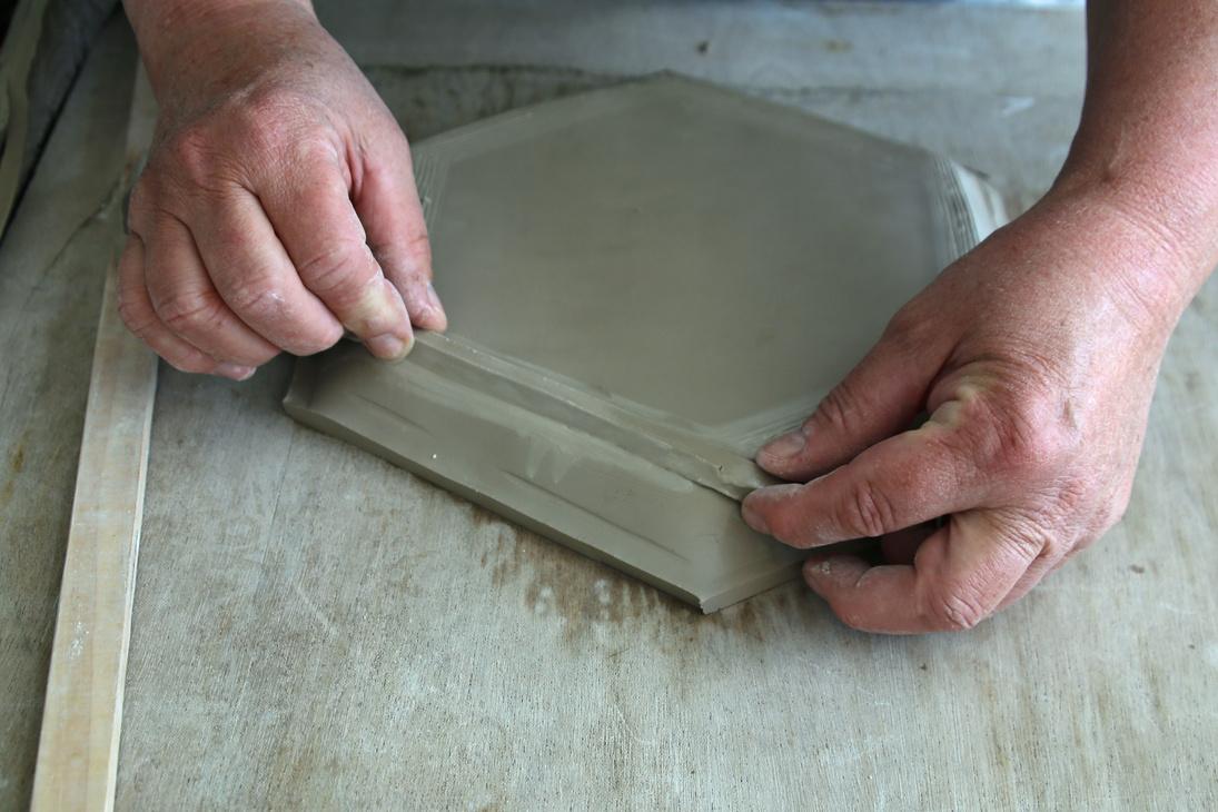 Dit helpt kromtrekken en scheuren in een later stadium te voorkomen. Maak daarbij gebruik van een gladde doek die je onder de klei legt zodat de kleiplaat makkelijker op te tillen is als hij nog erg nat is (bv een oud laken).