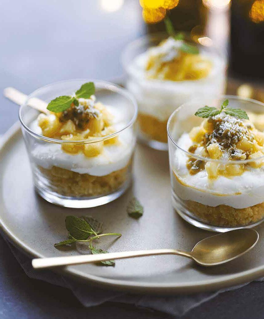 27 Petits toasts à la tartinade de dattes et au maquereau fumé 35 Tempura d’huîtres aux cacahuètes au wasabi et mayonnaise au citron vert et billes de concombre 39 Mojito au Gimber 40 Scampis croustillants et salade vietnamienne croquante 45 Campari fizz 46 Rouleau feuilleté à la patate douce, coco et dattes 53 Berry fizz 53 Nona apple spritz 55 Moules à la mousse de beurre blanc 55 Chou-rave et brunoise de légumes d’hiver 55 Radis à la truite fumée, mayonnaise à l’estragon et oignon rouge 57 Trou Normand 70 Amaretto sour