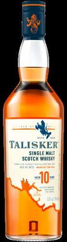 L’écossais Talisker single malt Scotch whisky 10 years (45,8 %, 70 cl) possède le célèbre goût de tourbe fumé et sa fin de bou che est très chaleu reuse. Son goût puissant est caractéristique de la beauté sauvage de l’île de Skye, où il est distillé.