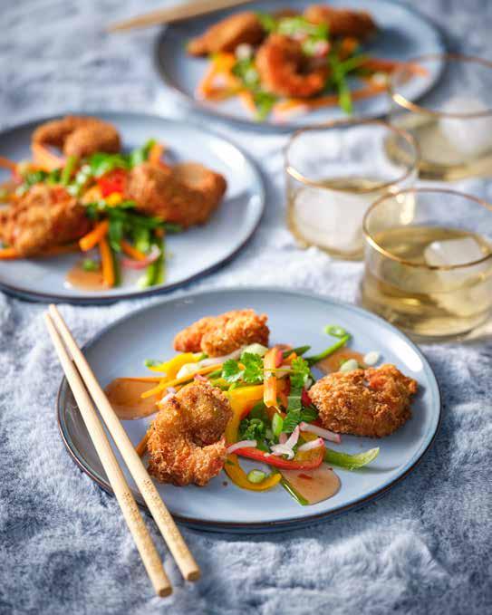 Crevettes dans un habit croustillant, accompagnés d’une sauce chili relevée. Qui pourrait leur résister ?