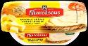 2 Leg op elk sneetje lichtbruin brood een sneetje kipfilet. Bestrooi met kerriepoeder en leg er een sneetje kaas op. Dek af met een sneetje wit brood.