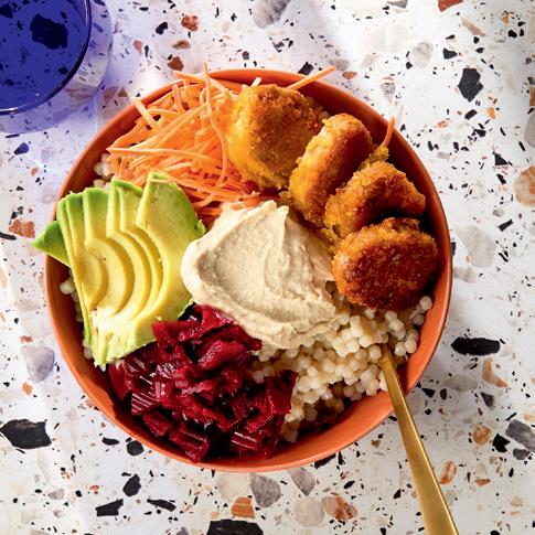 4. Verdeel de parelcouscous over kommen. Schik de nuggets, de avocado, de rode biet en de geraspte wortel mooi naast elkaar. Werk af met een lepel hummus in het midden.