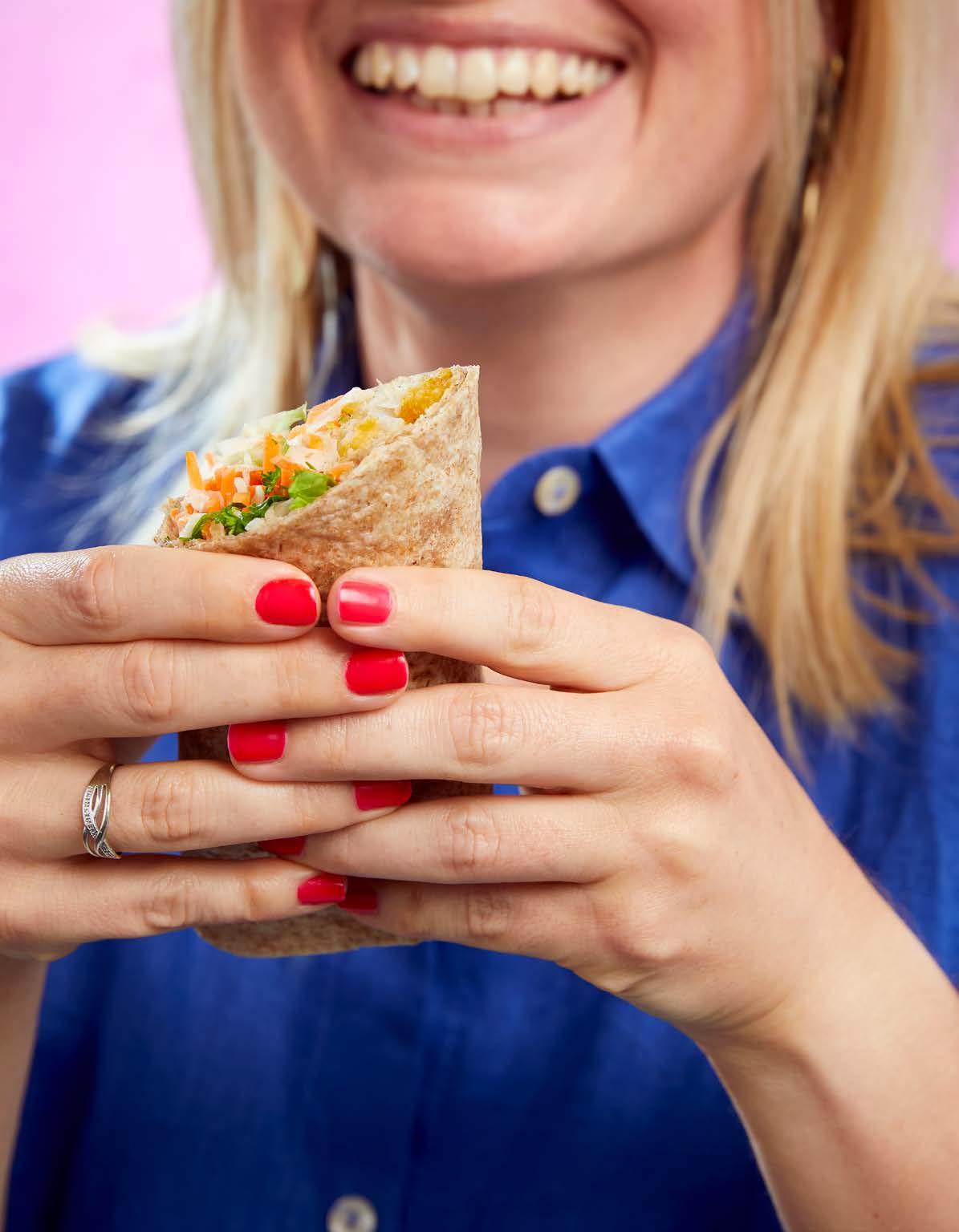 Repliez la partie du bas du wrap sur la farce et roulez en serrant. Fixez avec un bâtonnet cocktail.