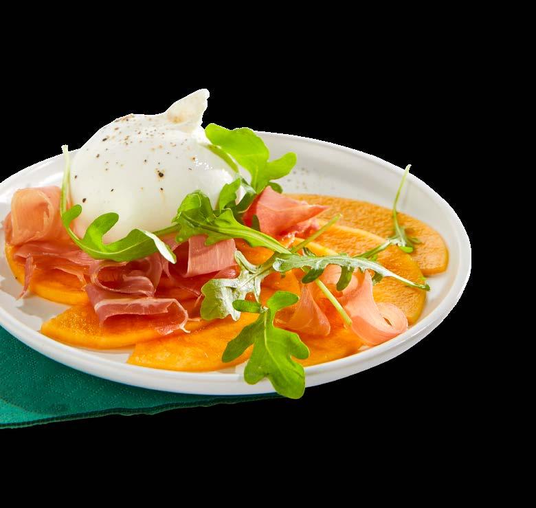 4 TRANCHES DE JAMBON SERRANO • 20 FEUILLES DE ROQUETTE • 1/2 MELON CHARENTAIS • 4 BURRATAS (FROMAGE FRAIS ITALIEN) • 1 C. À CAFÉ DE SUCRE DE BETTERAVE FIN • 2 C. À SOUPE DE GIN
