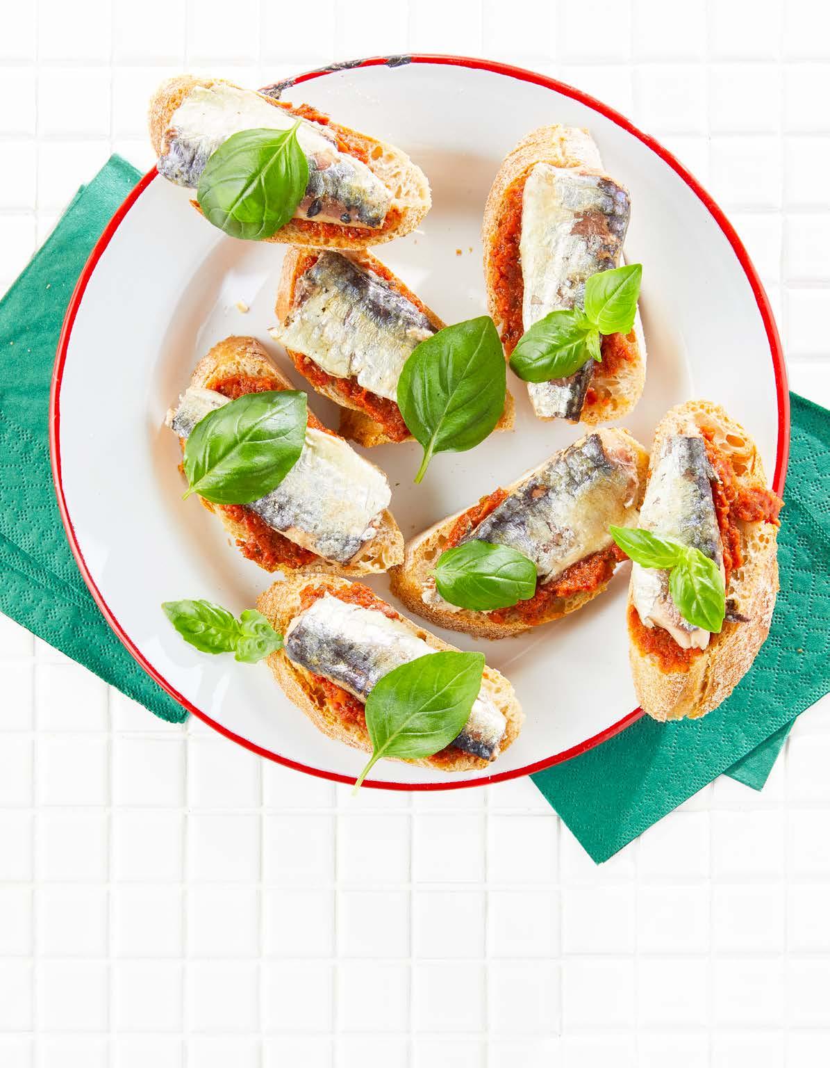1 Coupez la baguette en tranches et frottez-les avec l’ail pelé. 2 Tartinez de tapenade et disposez les sardines par-dessus. Garnissez d’une feuille de basilic.
