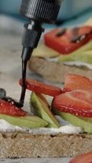 1 AVOCADO • 4 AARDBEIEN • 150 G GEITENKAAS MET HONING 8 SNEETJES DONKER MEERGRANENBROOD • BALSAMICOCRÈME
